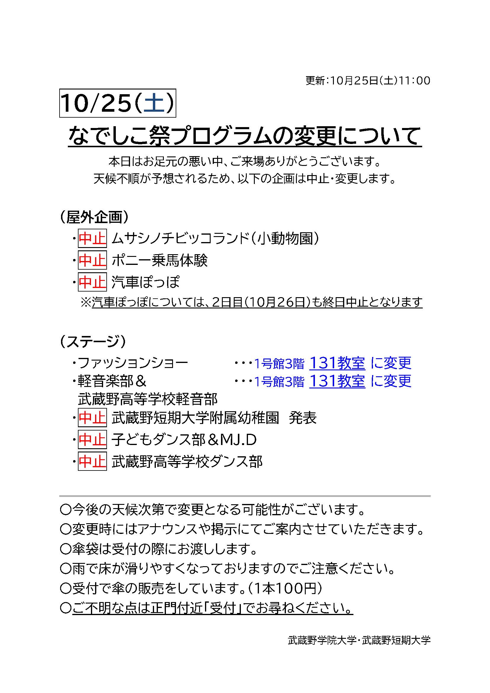 10/25(土)なでしこ祭プログラムの変更について(11:00現在)