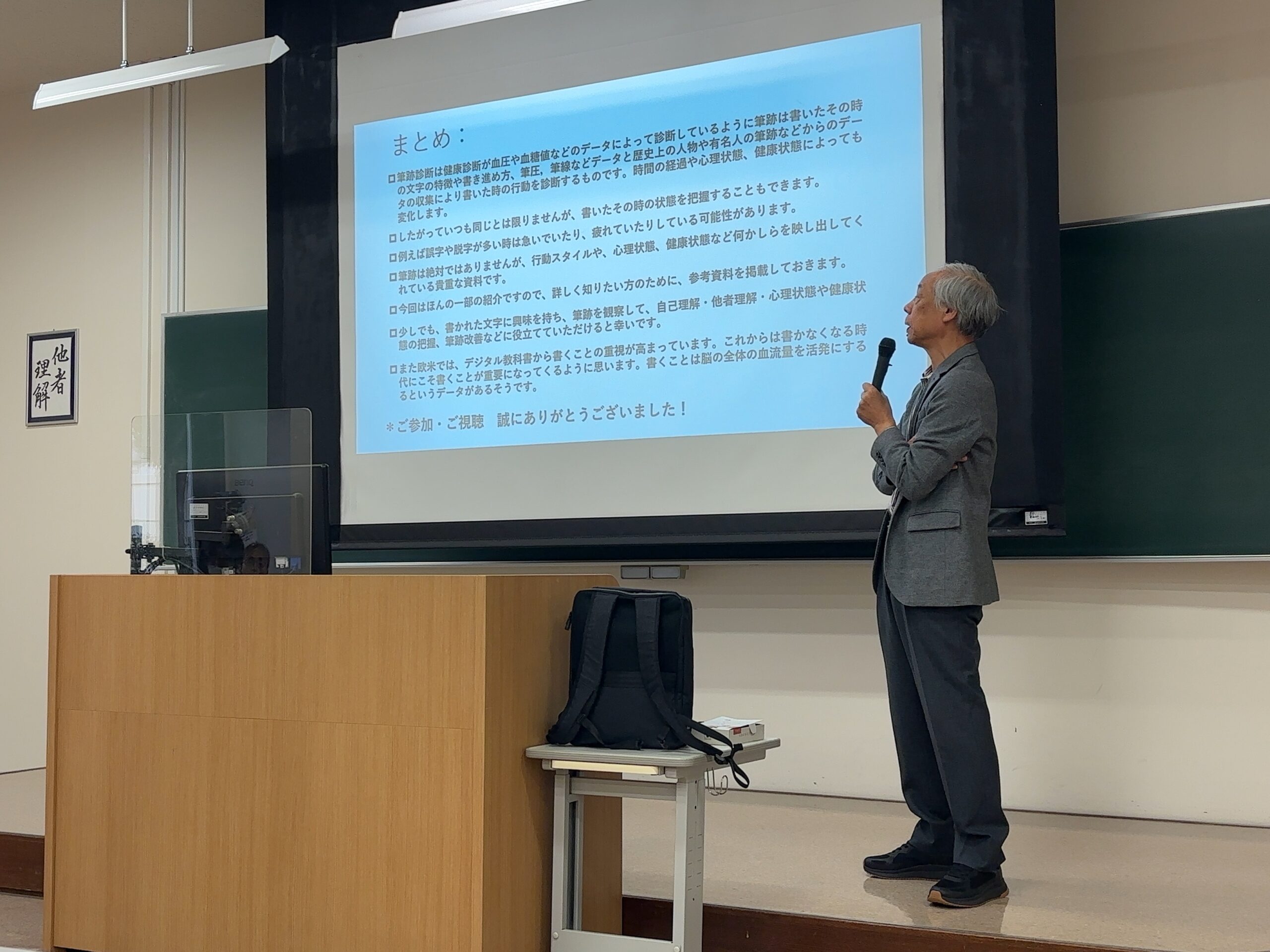 午後の部は筆跡研究所代表・ 元武蔵野学院大学教授の齋藤英男先生による「 筆跡と個性について」です。