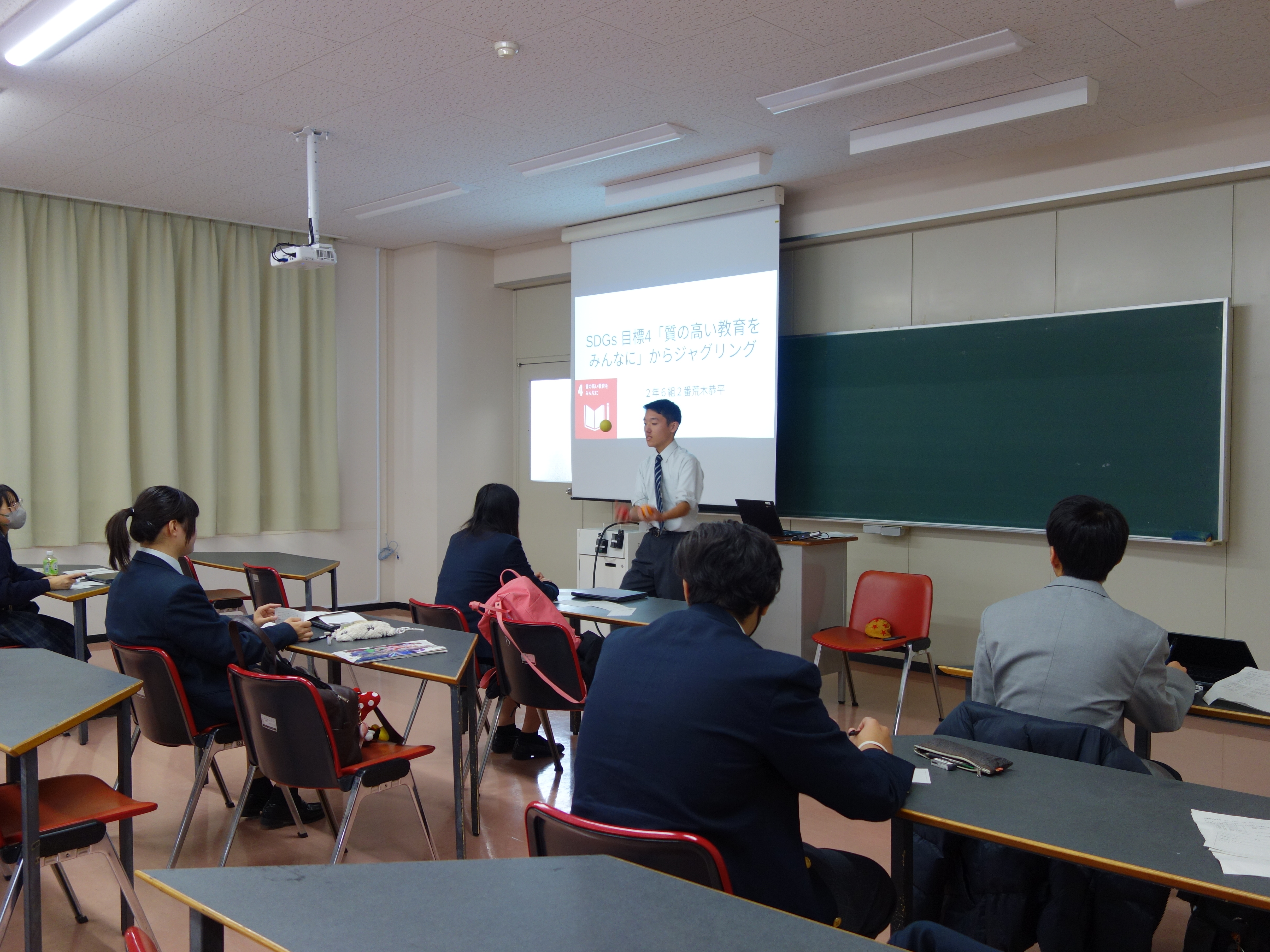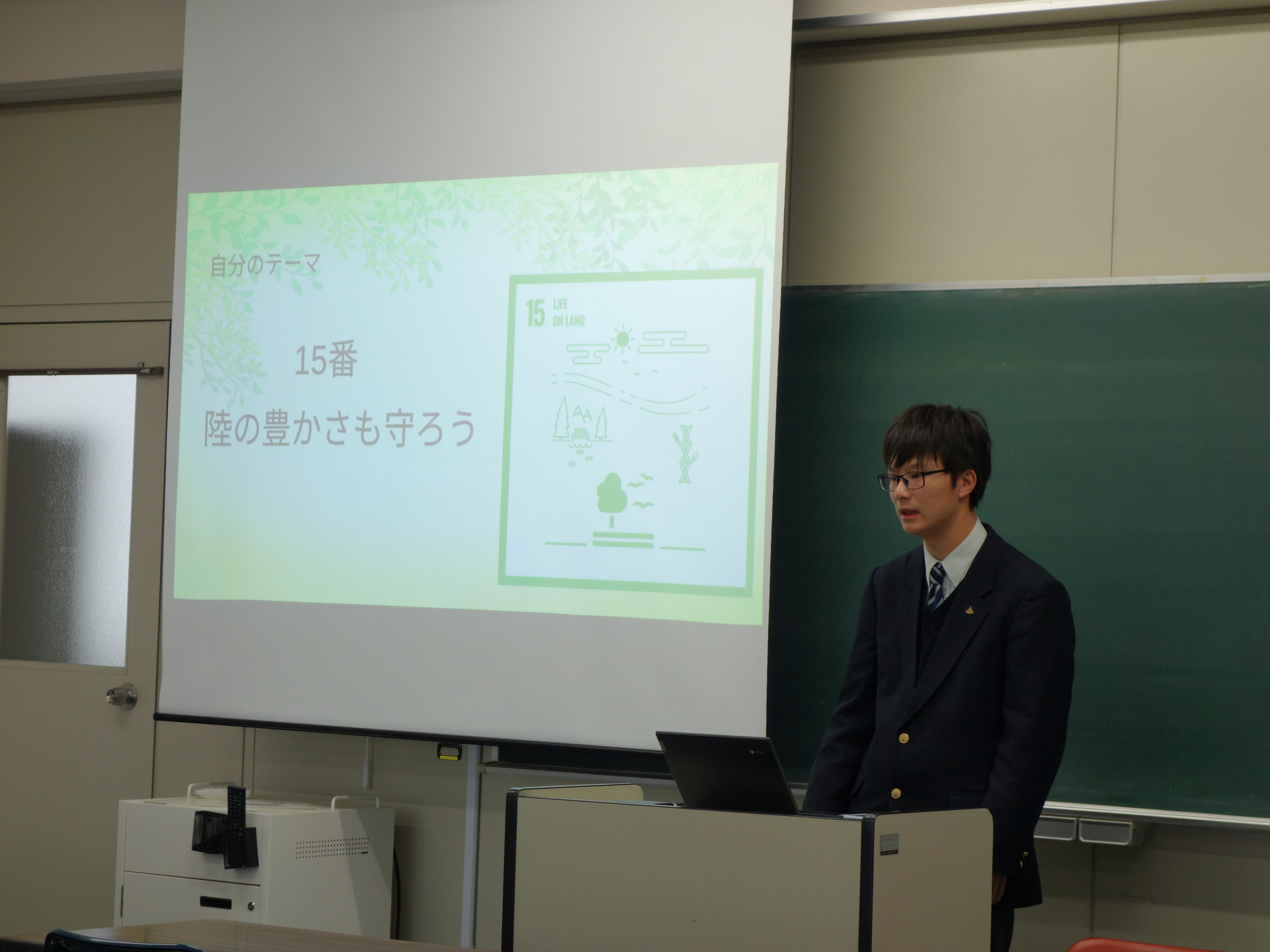その後、大教室に全員が集合し、5名の代表者が大学教員の前で発表を行いました。発表を聞いた教員からは「課題を発見する力」や、「高校生らしいユニークな観点での探究」に対する高い評価が聞かれました。さらに講評では、これから視野や世界が広がっていくであろう高校生に向けて、継続的に課題を見つけて思考していってほしいという期待や、情報の収集と活用についてのアドバイスが伝えられました。