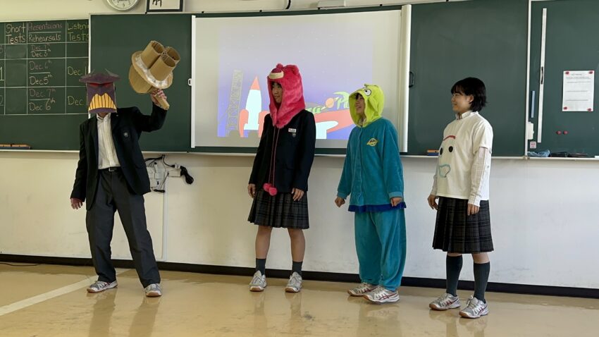 思い出の写真を散りばめたスライドやムービーを流しながら6年分の想いを英語で伝えた先日のプレゼンを経て、今回は自分たちで脚本・演出を考えたオリジナル英語劇を披露!