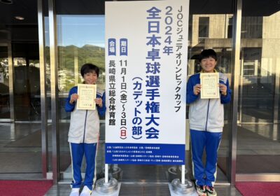 11月1日(金)~3日(日・祝)にかけて長崎県立総合体育館(長崎県長崎市)で行われた「JOCジュニアオリンピックカップ 2024年全日本卓球選手権大会(カデットの部)」に、中学卓球部が出場しました。