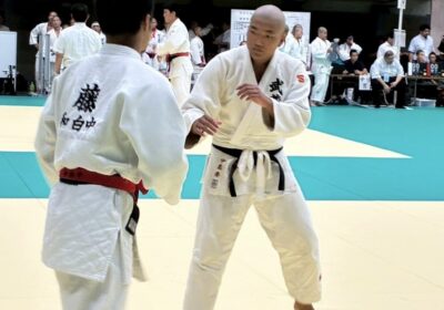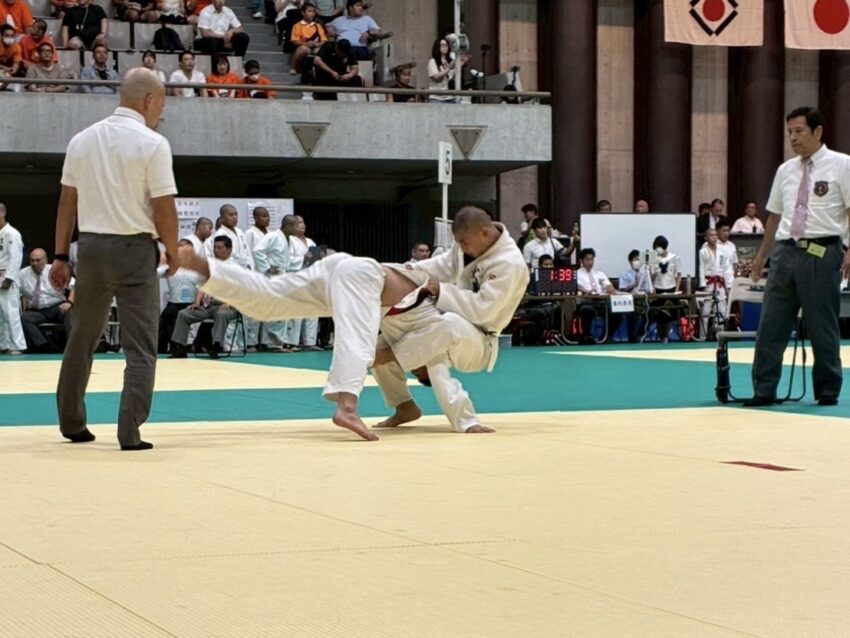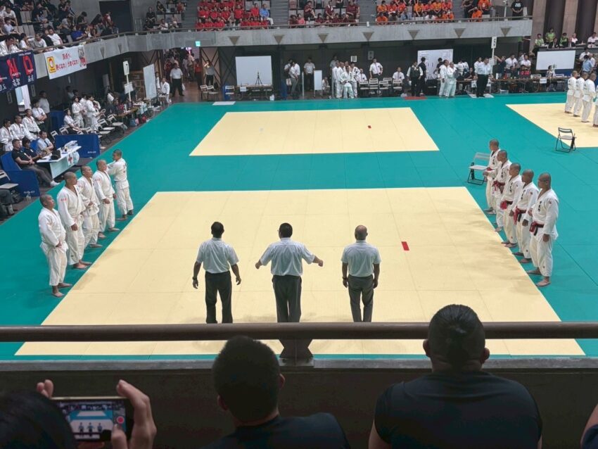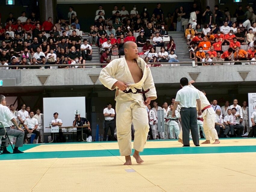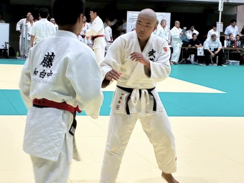 3人が引き分け、1人が技有りによる優勢負けを喫する拮抗した展開、0−1で迎えた大将戦、高橋君が見事に一本勝ちをあげ、内容勝ちで準々決勝進出を決めました!