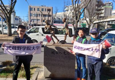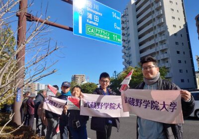 併設校の武蔵野学院大学3年生の佐野颯人さんが学連選抜に選ばれ、復路10区を走ることになったので、鶴見中継所付近で応援しました。