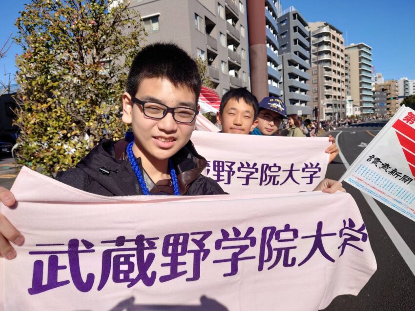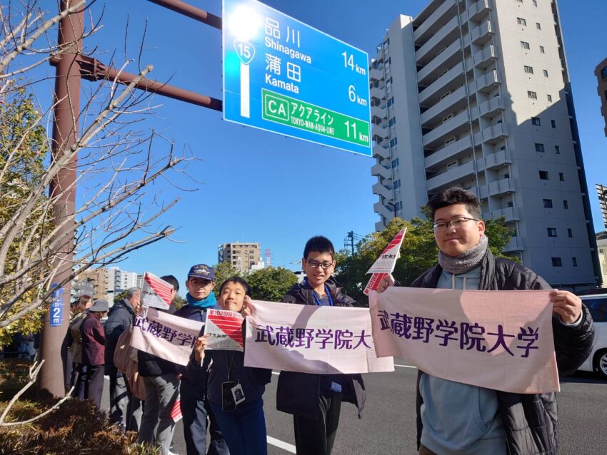 併設校の武蔵野学院大学3年生の佐野颯人さんが学連選抜に選ばれ、復路10区を走ることになったので、鶴見中継所付近で応援しました。