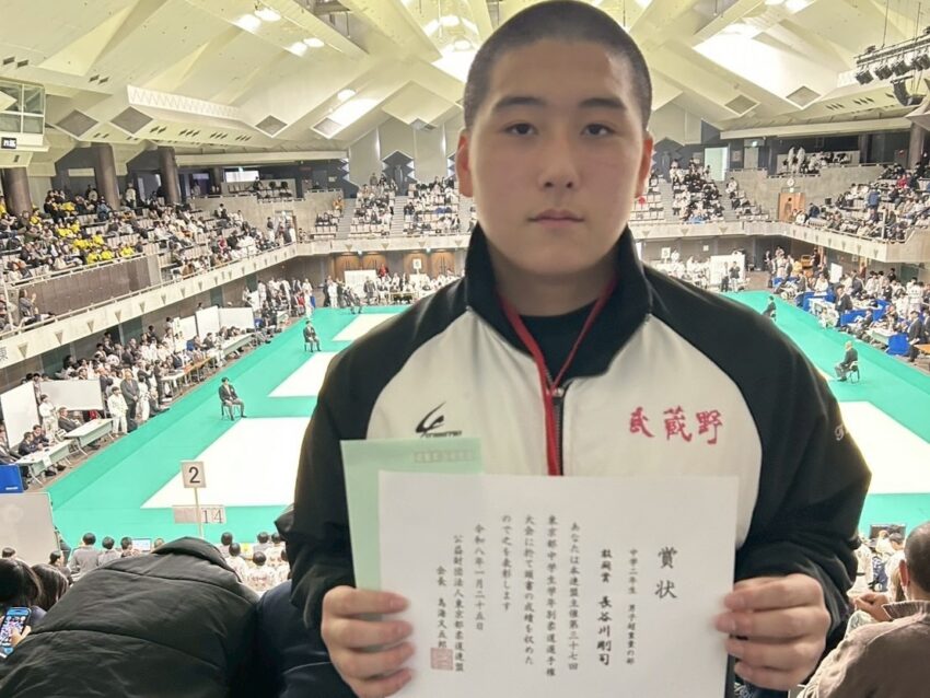 この大会は1〜3年の学年ごとに軽量の部・中量の部・重量の部・超重量の部の4階級に分かれて行われるもので、本校からは中学2年生男子重量の部に永井湊君、同超重量の部に長谷川剛司君、中学1年生男子重量の部に春日唯翔君、同超重量の部に風林太軌君、鶴丸壮太君、菱川大地君の6名が出場しました。