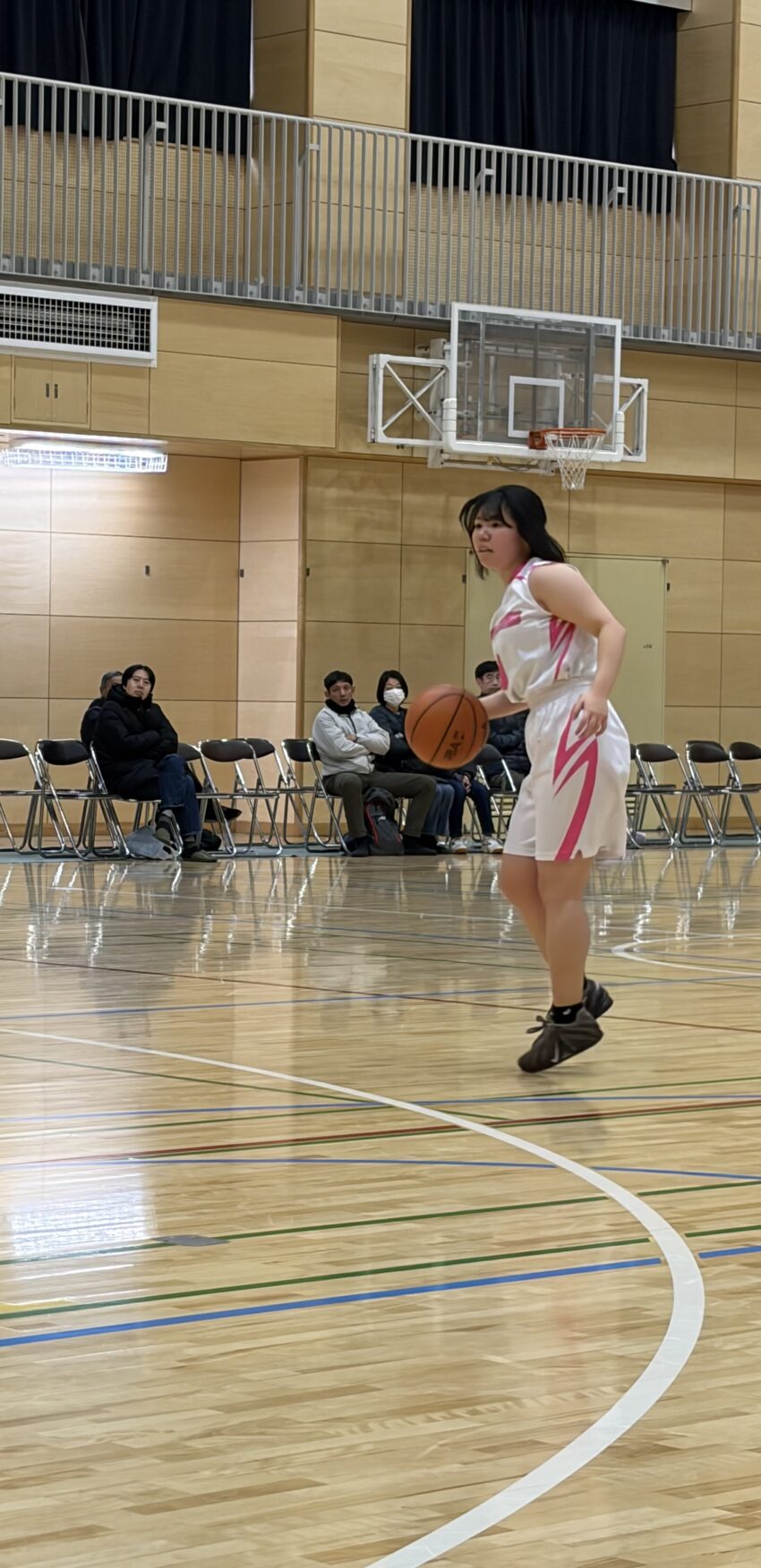 相手のガードに翻弄されるもこちらもタイトなディフェンスと速攻で応戦し、安田さんのペネトレイトや竹山明衣さん(高校1年生)のミドルシュートが光り前半を49−19で折り返し。