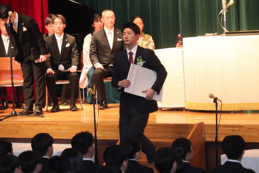 さらに、担任の先生方がクラスの生徒の名前を読み上げ、それに応える一人ひとりの「返事」、その後に代表者が受け取った卒業証書授与。