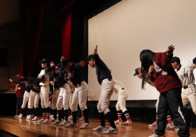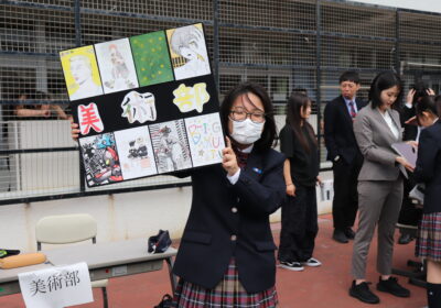 まずはダブルダッチ部、デジタルメディア部、ブラスバンド部、チアダンス部、声楽部、野球部、女子バスケットボール部、演劇部、ダンス部といったクラブが講堂内で映像や演技などを発表し、その後は各クラブの勧誘を校庭で行いました。