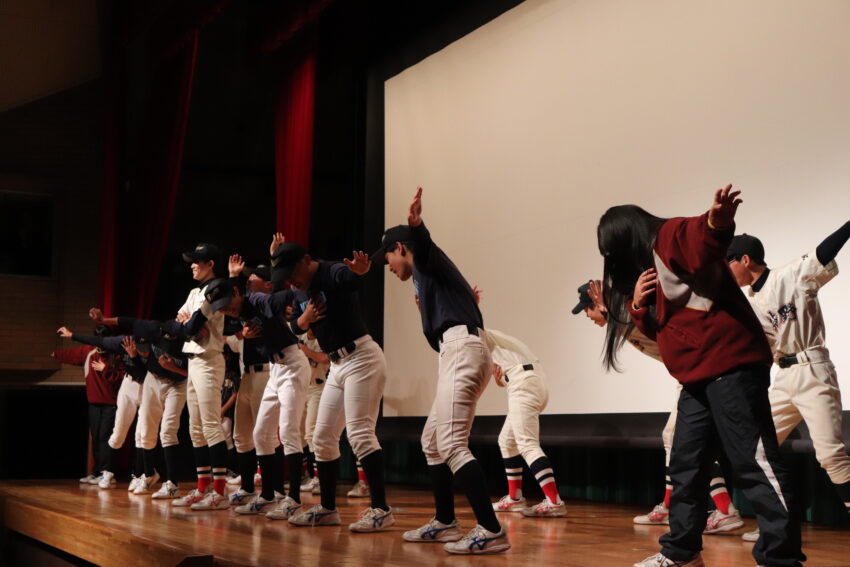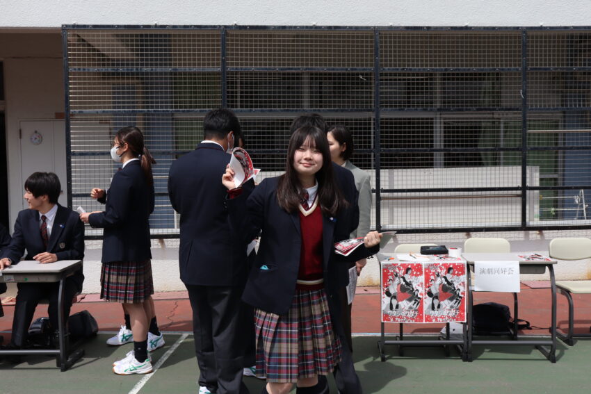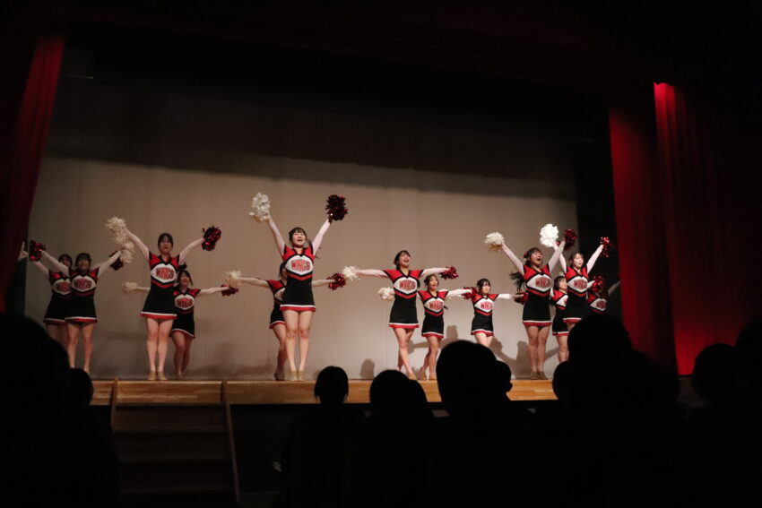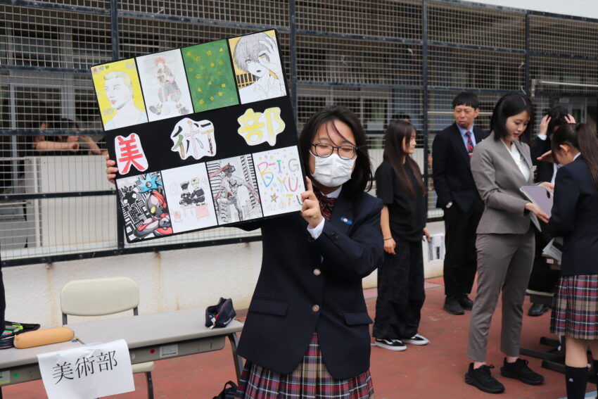 まずはダブルダッチ部、デジタルメディア部、ブラスバンド部、チアダンス部、声楽部、野球部、女子バスケットボール部、演劇部、ダンス部といったクラブが講堂内で映像や演技などを発表し、その後は各クラブの勧誘を校庭で行いました。