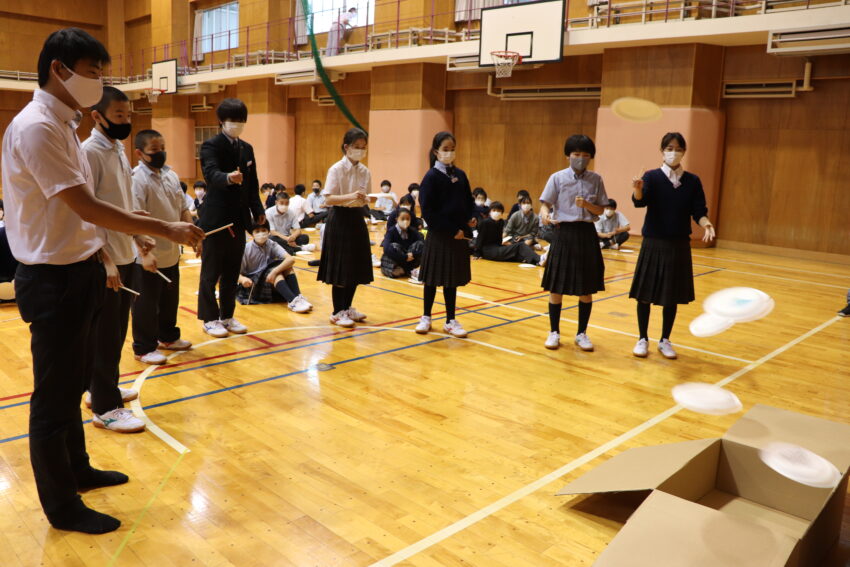 前半は、紙皿で作ったUFOを目的地に飛ばすというミッションにグループで挑み、メンバー同士が試行錯誤しながら真っ直ぐ飛ばす方法を教え合って、最終的に他のグループと競いました。
