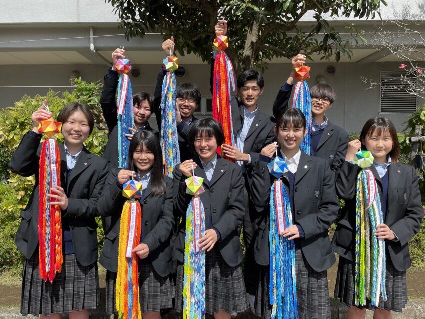 高校3年生 修学旅行に行ってきます2022年04月16日学校生活高校 高校3年生が18日(月)から3泊4日で沖縄に修学旅行に行ってきます! 今週すでに荷出しを終えていて、本日はひめゆりの塔に奉納する千羽鶴を、各クラスの折り鶴担当の代表生徒と一緒に記念撮影をしました。 高校2年生で実施するはずだったのが延期に次ぐ延期で、満を持しての修学旅行。 さらに高校では3年ぶりとなる宿泊行事、みんなで楽しんできます!!
