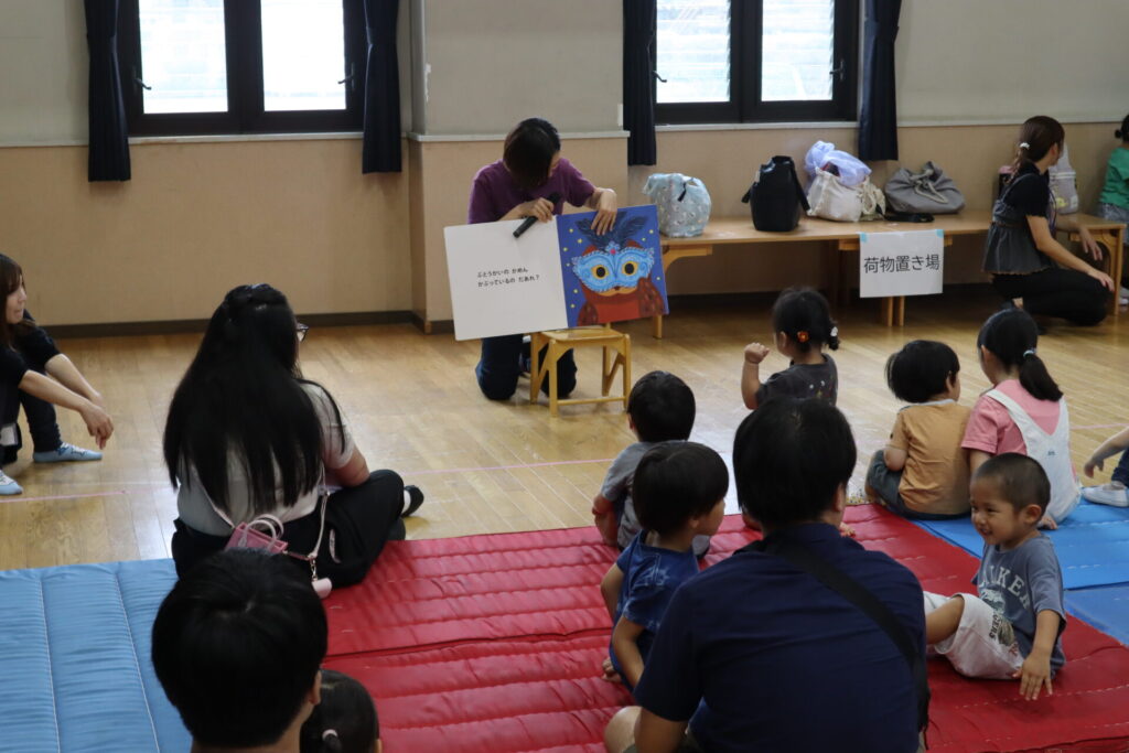 先生の近くに集まり大型絵本を見たあとは、朝のうたを歌ったり、名前を呼ばれて「はーい!」とお返事をしたりと朝の会の時間。