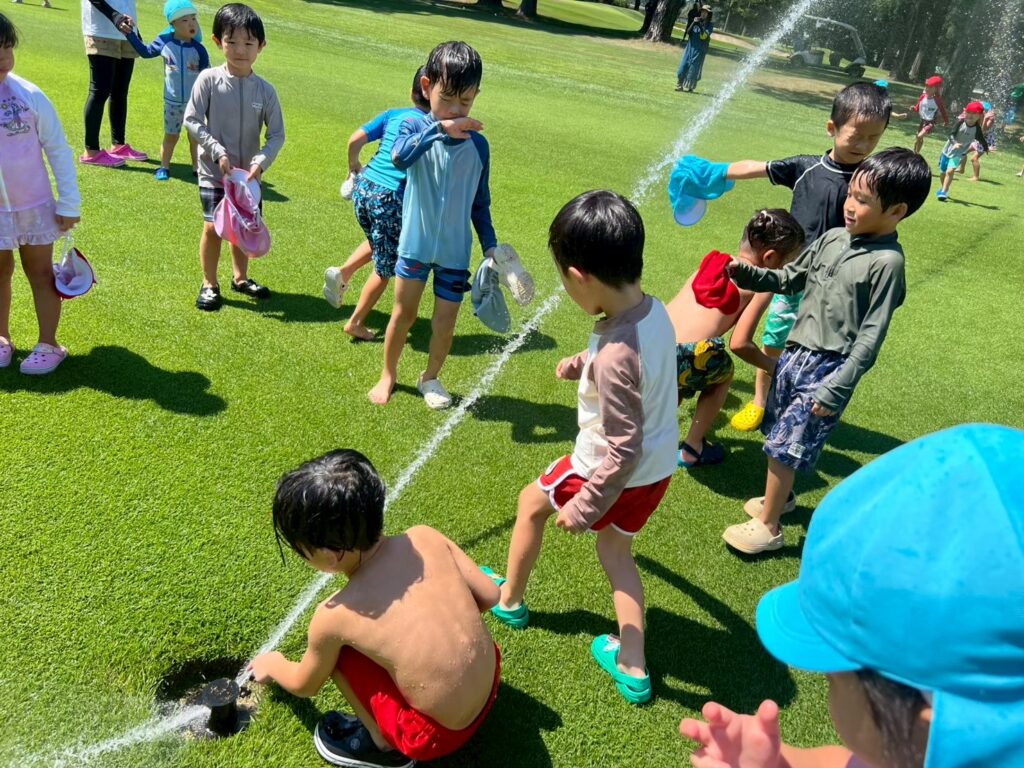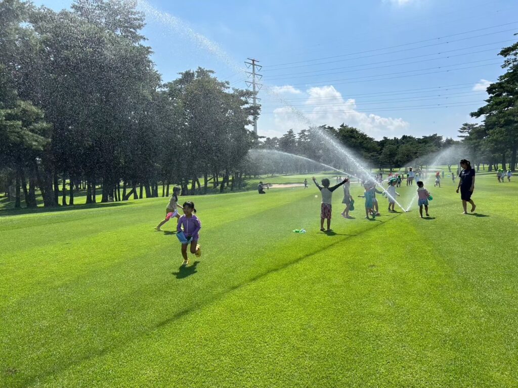 この日は残暑がきびしく、カントリークラブにお計らいいただき、スプリンクラーの水まきであそんできました。